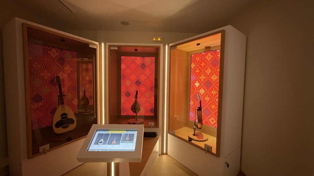 • Traditional Musical Instruments: An application that highlights the art and sound of the traditional musical instruments of Anogeia, allowing visitors to live a truly unique musical experience. Three physical musical instruments, a lyre, a lute and a mandolin, are presented in specially designed showcases embedding three digital screens. While interacting with the system, each showcase “comes to life”, by activating:
