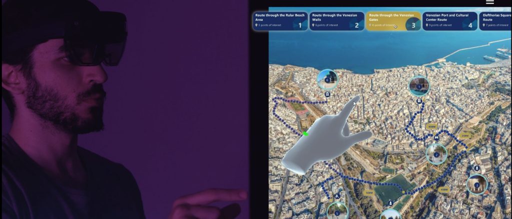 - Heraklion City Augmented Reality (AR): The augmented reality application enriches a large-scale model of the city using a mixed reality headset. Users can navigate routes and points of cultural interest, experiencing an interactive exploration of the city. The application is available to the general public through the Info Point, Tourism Office and international exhibitions and events organized by the Municipality of Heraklion.