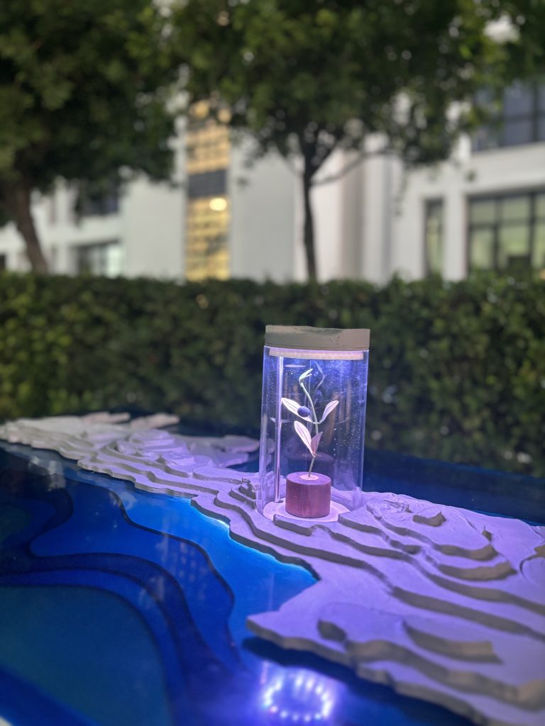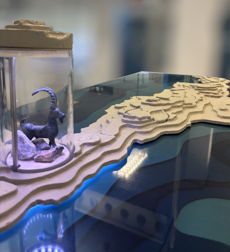 The tabletop is made of colored resin in varying shades of blue, symbolizing the surrounding sea. Resting on this surface is a precisely cut wooden silhouette of Crete, serving as a base for further artistic interpretation. Layered wooden elements form an abstract representation of the island’s mountainous terrain, prioritizing expressive and tactile qualities over strict topographical accuracy. LED lighting integrated around the perimeter enhances both aesthetics and usability by highlighting key features and guiding user attention.