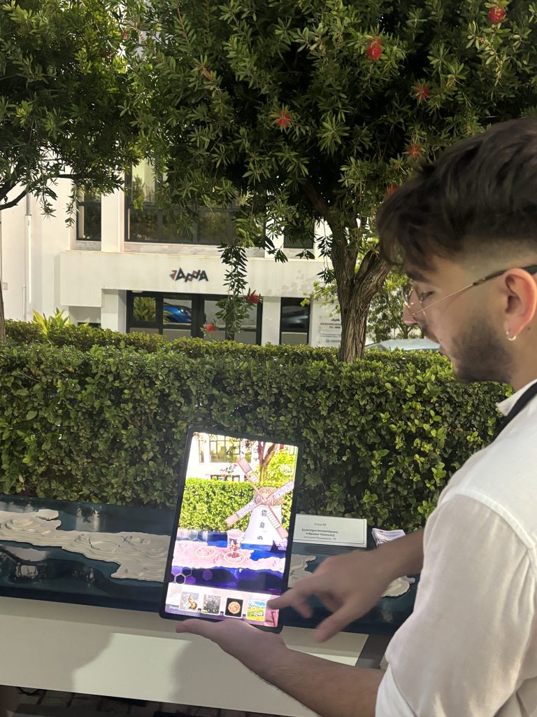 Crete AR is an advanced interactive system that leverages cutting-edge Mixed Reality (MR) and Augmented Reality (AR) technologies to encourage immersive virtual exploration of the island of Crete. The system enables users to navigate a wide range of points of interest—including cities, monuments, and cultural landmarks—through a seamless blend of digital and physical interaction. By selecting locations on a three-dimensional representation of Crete, users trigger the projection of rich digital content, such as animated 3D models and contextual narratives, onto AR or Mixed Reality devices, creating a distinctive and engaging exploratory experience.