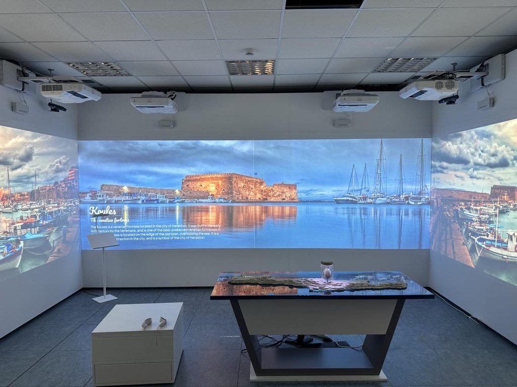 Four openings are embedded along the model, each containing a plexiglass showcase mounted on advanced mechatronic mechanisms. These showcases house culturally significant artifacts linked to specific regions of Crete. Equipped with touch-sensitive surfaces, the showcases can be activated by visitors, rising smoothly to reveal their contents while synchronized digital information appears on an overhead display and within the AR application.